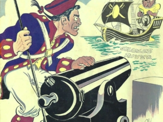 Bissell, who was a cartoonist for the Boston Globe, created the original Pat Patriot drawing for the Globe. Upon seeing the drawing in publication, then Patriots owner Billy Sullivan reached out to Bissell to secure the revolutionary soldier hiking a football as the team’s logo. Bissell created the game program covers for several years using humor and creativity to create original artwork.