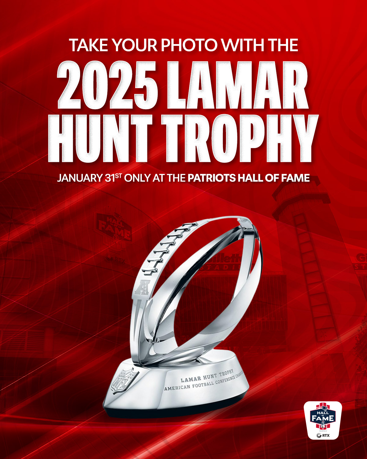 Visit the Patriots Hall of Fame on Saturday, January 31 and take a photo with the brand new 2025 Lamar Hunt Trophy!