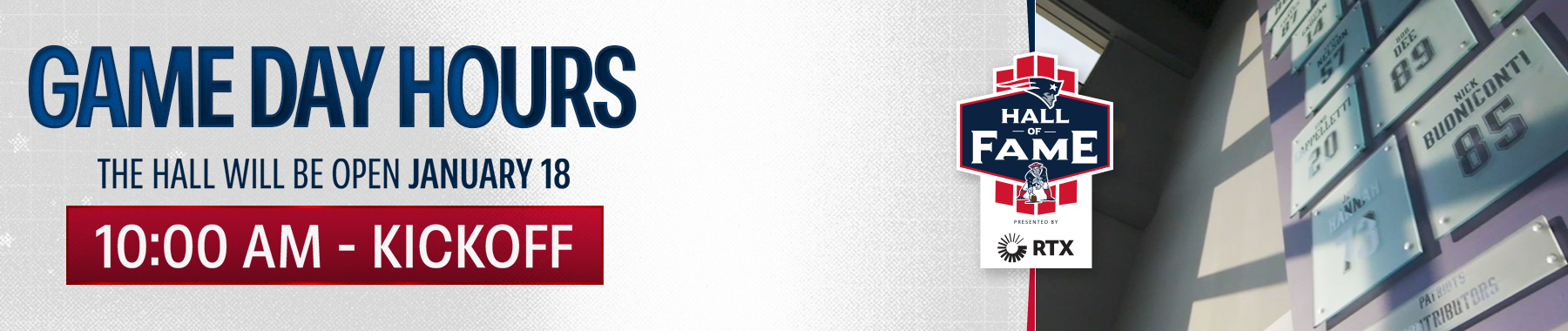 The Patriots Hall of Fame presented by RTX is closed on Thanksgiving, Christmas and Easter. It also closes for private events. Those closures will be listed here or can be confirmed by calling (508) 698-4800.